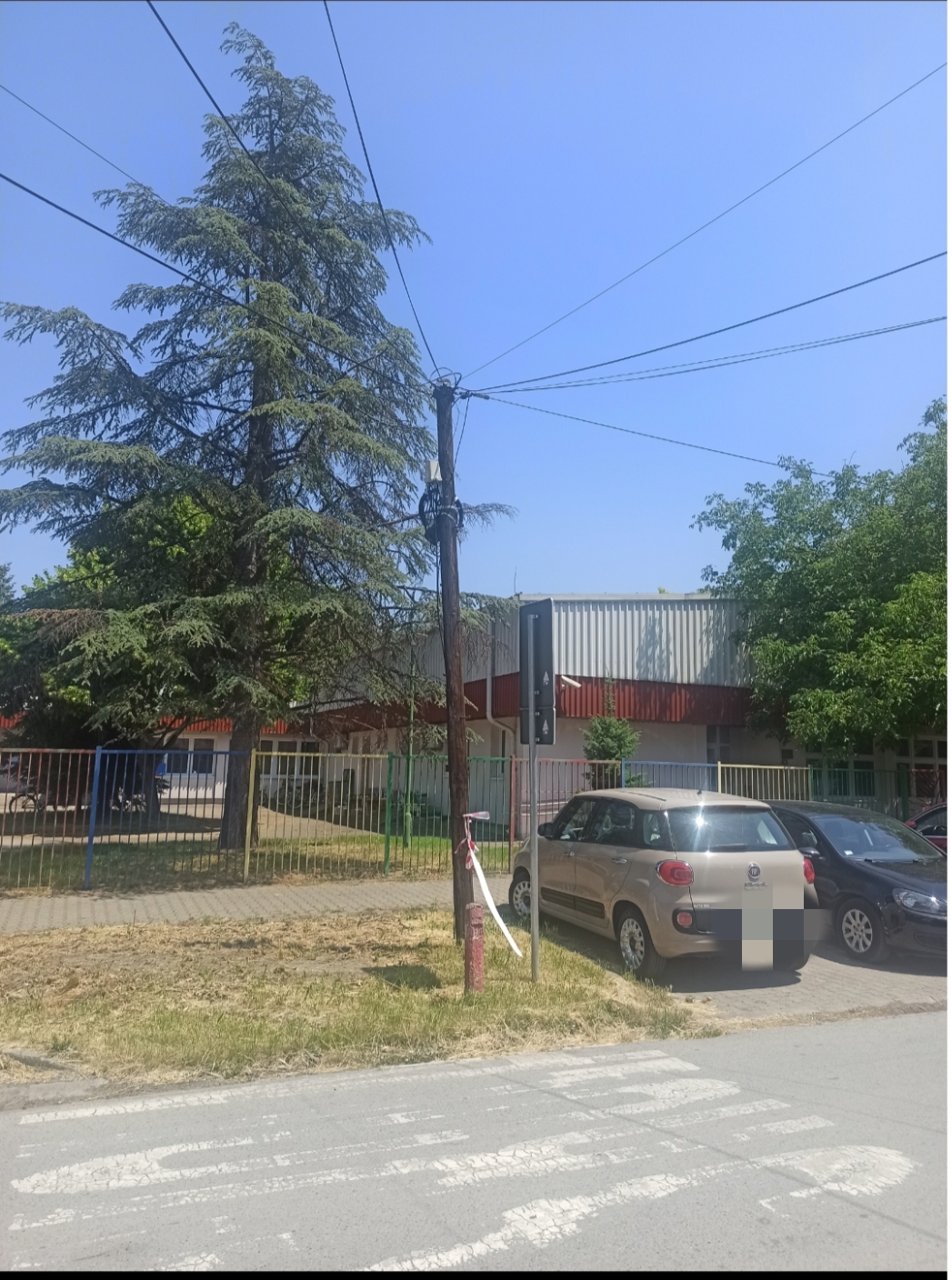Дрвена бандера испред вртића је јако накривљена, и није једина таква у улици.