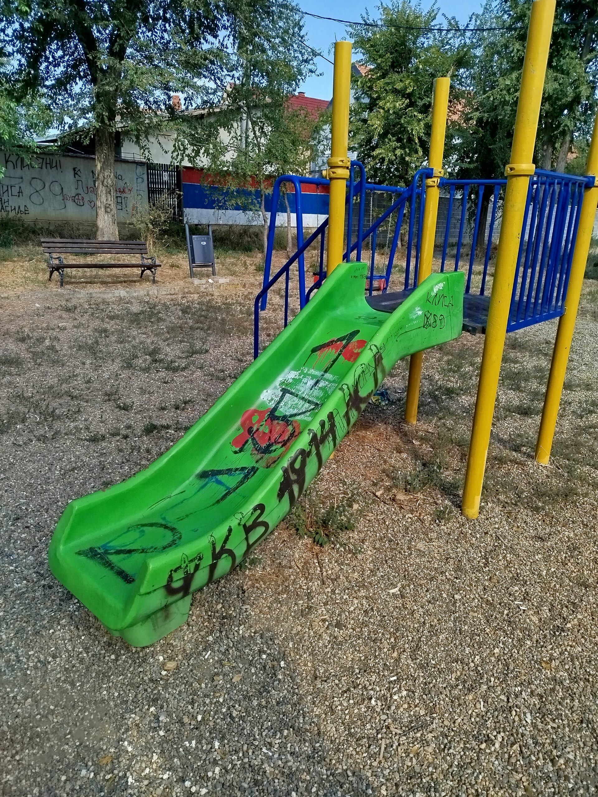 Godinama ovo igralište je zapušteno i obraslo rastinjem. Tobogan i klackalice su stari. Kome se obratiti kako bi se renoviralo? Ovde nema saobraćaja i idealno je mesto da se deca igraju.